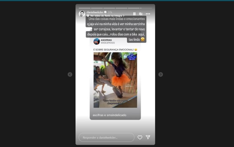 ‘‘Uma das coisas mais lindas e emocionantes que já vivi na minha vida foi ver a minha serzinha [Madalena] ser corajosa, levantar e tentar de novo depois que caiu. Rolou esses dias com a bike [bicicleta], tão lindo’’, declarou Daniel, que ainda inseriu um emoji de olhos brilhando, nesta sexta-feira (10). O baterista havia compartilhado um vídeo de um pai acompanhando a filha a andar de skate e em um certo momento a criança acabou caindo. Então, o pai a incentivou emocionalmente a não desistir.
