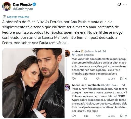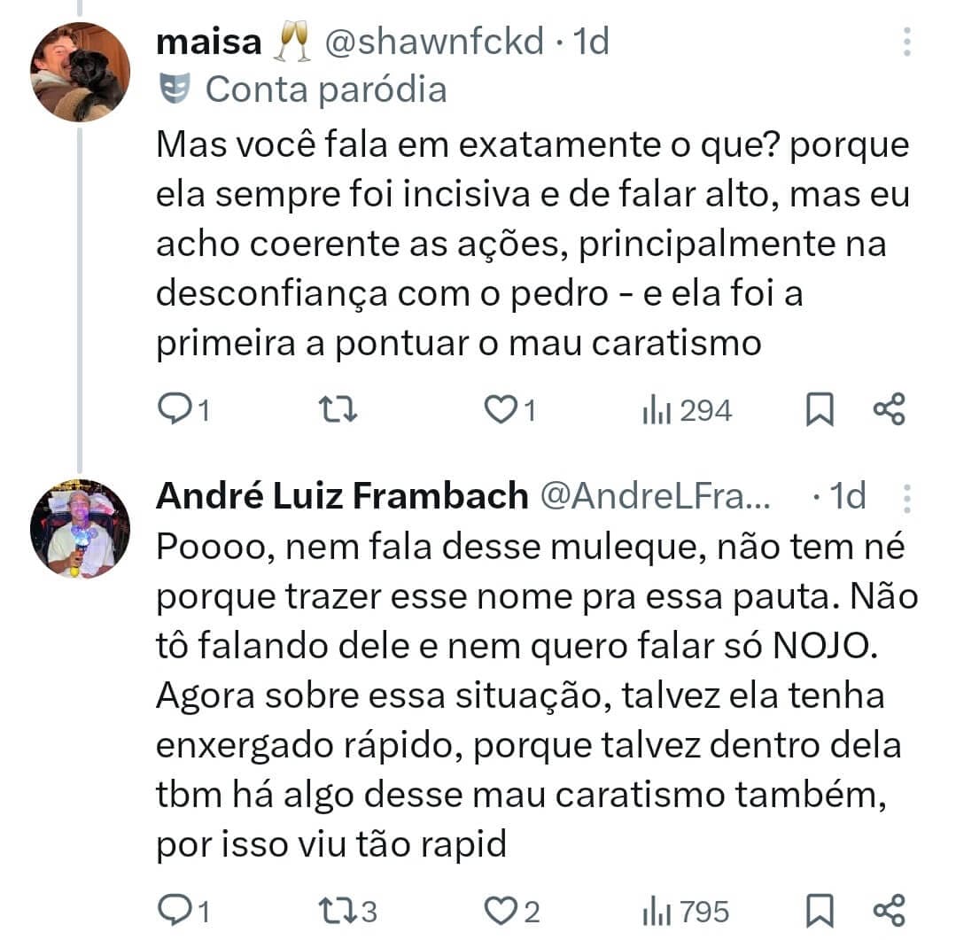 Mas a treta não parou por aí. O marido da atriz, André Luiz Frambach, entrou na confusão e deu o que falar ao comentar uma postagem de Dan Pimpão sobre Pedro, do BBB, e a jornalista Ana Paula Renault. Frambach deixou uma insinuação pesada sobre a sister.