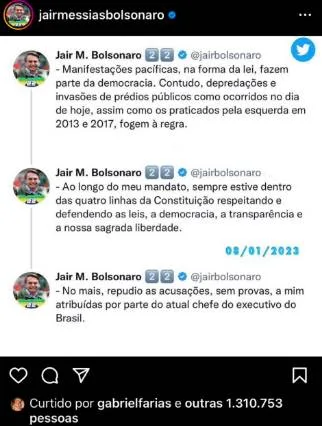 Os usuários perceberam que Gabriel curtiu um post onde o ex-presidente do Brasil corroborou com atos antidemocráticos que aconteceram ontem, 08 de janeiro, no Distrito Federal. Até o momento nem a ex-Ilha Record ou Farias comentaram as polêmicas.
