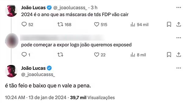 “2024 é o ano que as máscaras de todos os FDP vão cair“, disse João Lucas em seu perfil, atraindo comentários de seguidores curiosos pedindo “exposed” do caso. “É tão feio e baixo que não vale a pena“, disse ele, na rede social.
