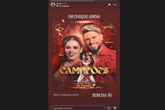 Tati falou sobre a final da competição e agradeceu ao professor de dança Diego Maia pelo apoio. “Com muita garra, dedicação e superando todos os obstáculos, Tati e Diego brilharam e se consagraram os CAMPEÕES da Dança dos Famosos!”, afirmou.