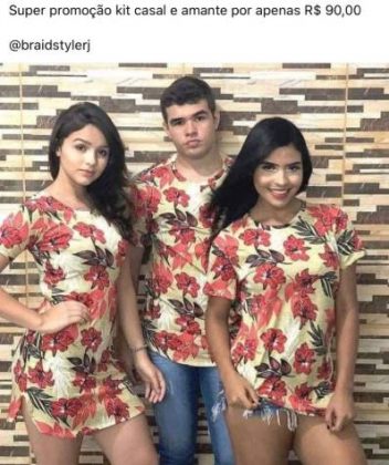 Neste fim de semana, um novo meme começou a circular pela web. Na imagem, um anúncio mostra um suposto namorado ao lado da atual e da amante, os três usam a mesma roupa e a oferta é “compre para sua namorada e leve para a amante”. É claro que a rainha da sofrência, Marília Mendonça, não deixou de brincar com a situação.