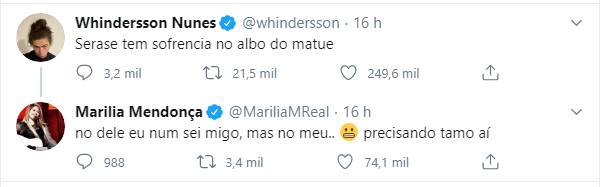 “Será se tem sofrência no álbum do Matue?”, escreveu ele. Marília então respondeu: “No dele eu num sei migo, mas no meu..precisando tamo aí.”