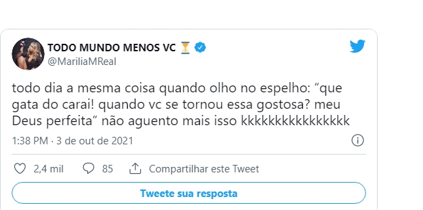 “Todo dia a mesma coisa quando olho no espelho: ‘Que gata do c*! Quando você se tornou essa gostosa? Meu Deus, perfeita’. Não aguento mais isso”, brincou.