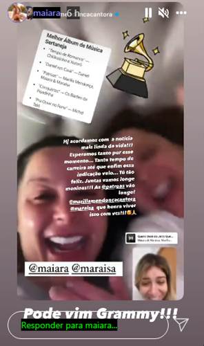 “Estamos vivendo um dos momentos mais incríveis da nossa carreira. Sonhamos tanto com o dia de hoje e trabalhamos muito por isso. É sobre não desistir… são tantas notícias boas que o coração treme para falar para vocês que as Patroas foram indicadas ao Grammy Latino. É alegria que não cabe no peito e escorre pelo rosto em forma de gratidão”, disseram as gêmeas em uma postagem nas redes sociais.