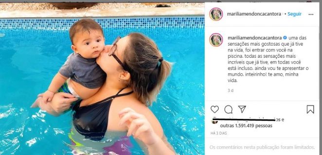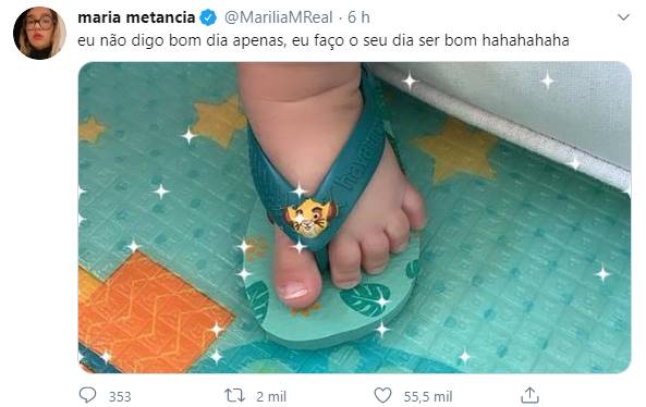 “Eu não digo bom dia apenas, eu faço o seu dia ser bom”, escreveu a sertaneja na legenda da foto. Em seguida, os fãs se derreteram. “Meu Deus, que coisa mais fofa”, reagiu um internauta. “Itimalia, que pezinho mais gordinho, Meu Deus, olha a batatinha da perna. Meu Deus Marília tudo que você faz é perfeito”, escreveu uma seguidora.