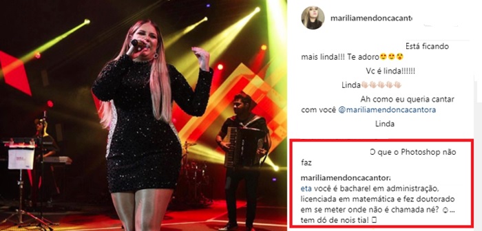 “O que o photoshop não faz”, escreveu a internauta, afirmando que Marília editou a imagem para parecer mais magra. Incomodada, a cantora rebateu o comentário: “Você é bacharel em administração, licenciada em matemática e fez doutorado em se meter onde não é chamada né? Tem dó de nós tia!”.