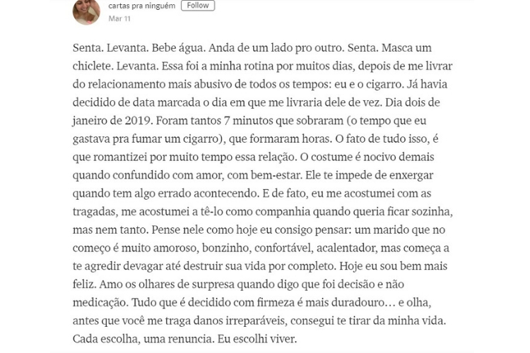 Marília, no texto, comenta a sensação que o cigarro dá de completar a sua vida, no entanto, “ele te impede de enxergar quando tem algo acontecendo”. Para concluir, ela dá detalhes de sua nova vida após largar o vício.