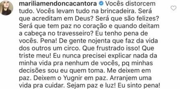 “Vocês distorcem tudo. Levam tudo na brincadeira.Será que acreditam em Deus? Será que são felizes? Será que tem paz no coração quando deitam a cabeça no travesseiro. Eu tenho pena de vocês. De gente nojenta que faz da vida dos outros um circo. Que frustrado isso. Que triste isso. Eu não precisei explicar nada da minha vida para nenhum de vocês, porque minhas decisões sou eu que toma. Me deixem em paz, Deixem o Yugnir em paz. Arranjem uma vida para cuidar. Sejam paz e luz. Eu sinto pena”, criticou a rainha da sofrência.