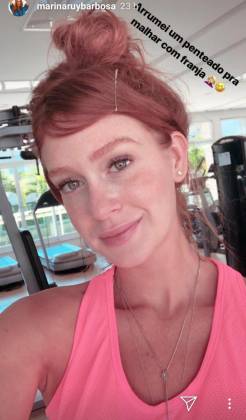 Em uma outra foto, a atriz, ainda sem maquiagem, apareceu em uma academia, e no clink escreveu: “Arrumei um penteado pra malhar com franja”.