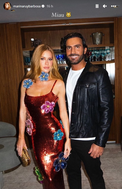O casal foi um dos convidados da festa de 50 anos da apresentadora Angélica, comemorada no último sábado (26). Na legenda do Story, Marina escreveu “Miau”, aparecendo com um vestido vermelho com várias flores.