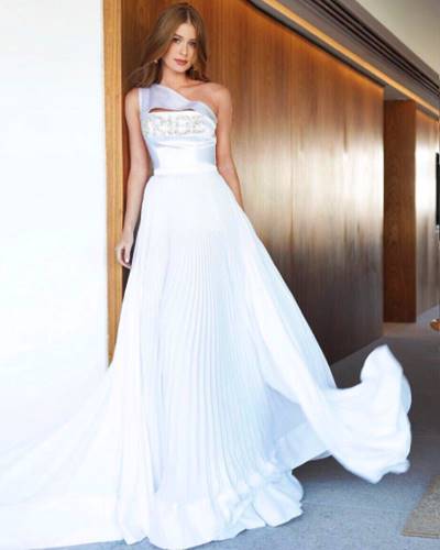 Sempre bem vestida, Marina apostou em um look todo branco para seu chá de lingerie. Ela usou um body com a palavra “bride (noiva)” bordada e uma saia longa.