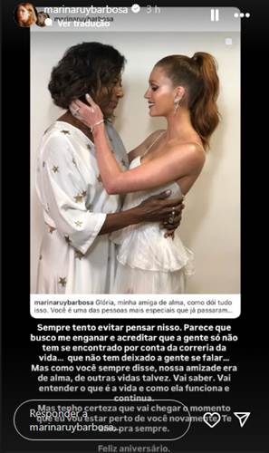 Marina ressaltou o forte laço de amizade que tinha com Glória: “Mas como você sempre disse, nossa amizade era de alma, de outras vidas talvez. Vai saber. Vai entender o que é a vida e como ela funciona e continua. “Mas tenho certeza que vai chegar o momento que eu vou estar perto de você novamente. Te amo para sempre. Feliz aniversário”, escreveu a artista.