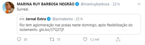 Marina Ruy Barbosa usou o Twitter para compartilhar uma notícia a respeito da situação e aproveitou para lamentar. “Surreal”, escreveu ela ao repostar uma matéria do jornal Extra com o título “Rio tem aglomeração nas praias neste domingo, após flexibilização do isolamento”.