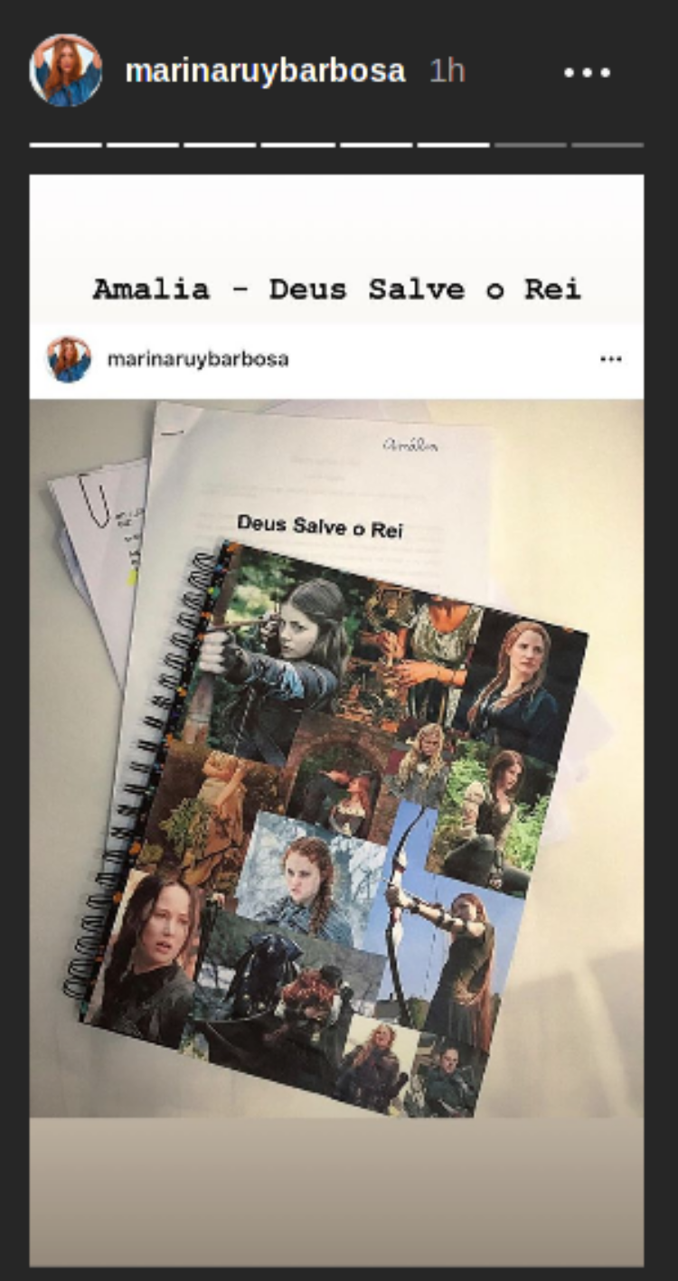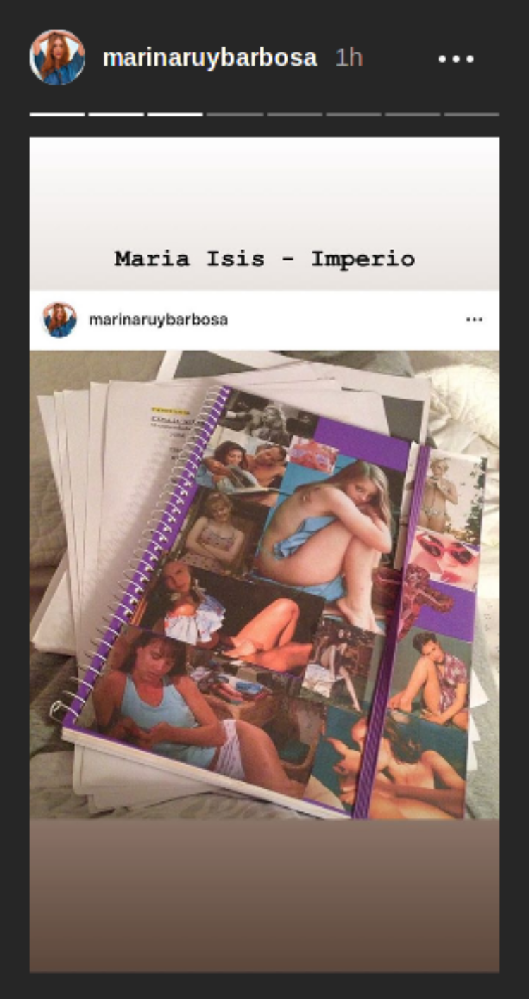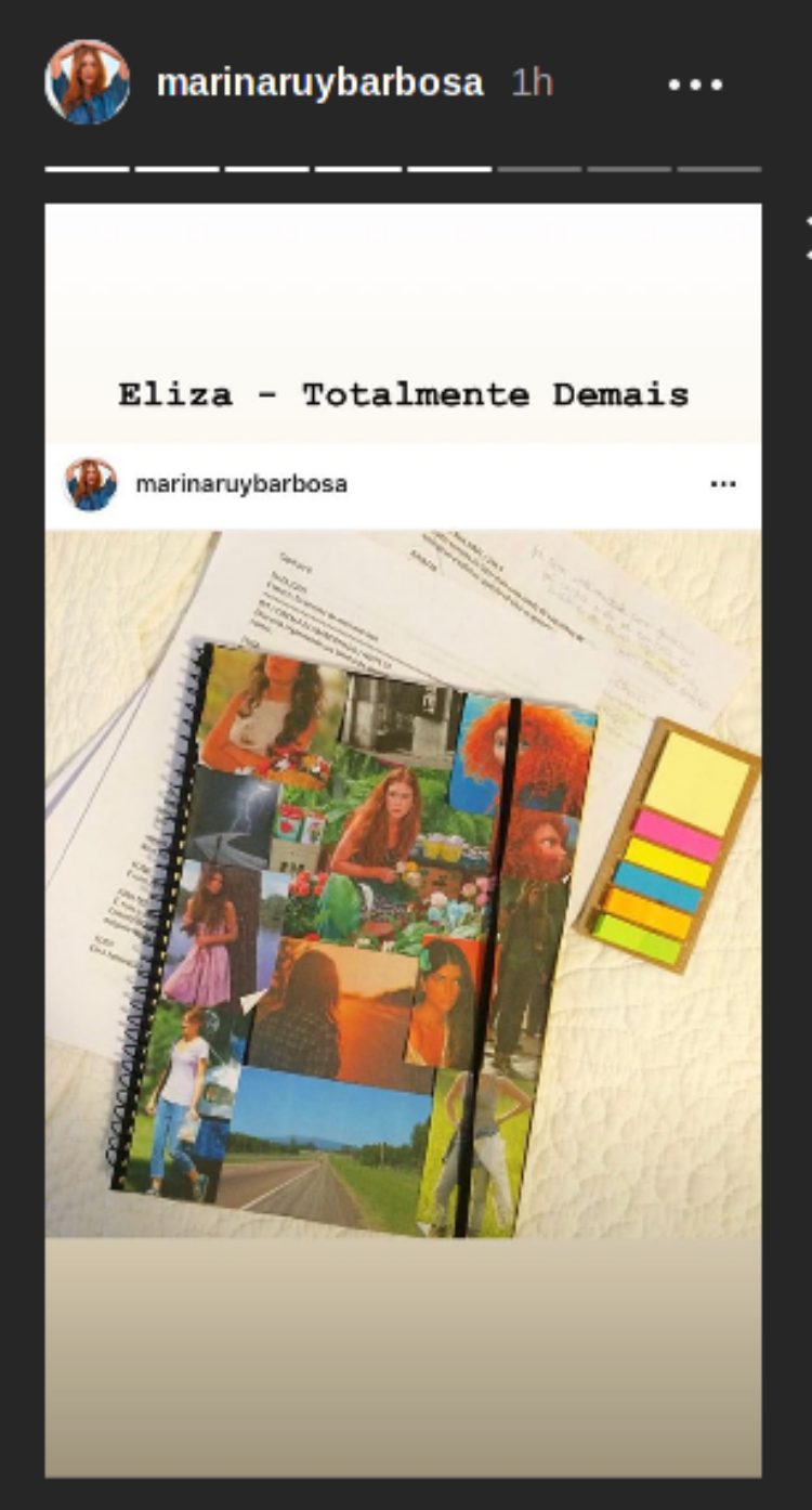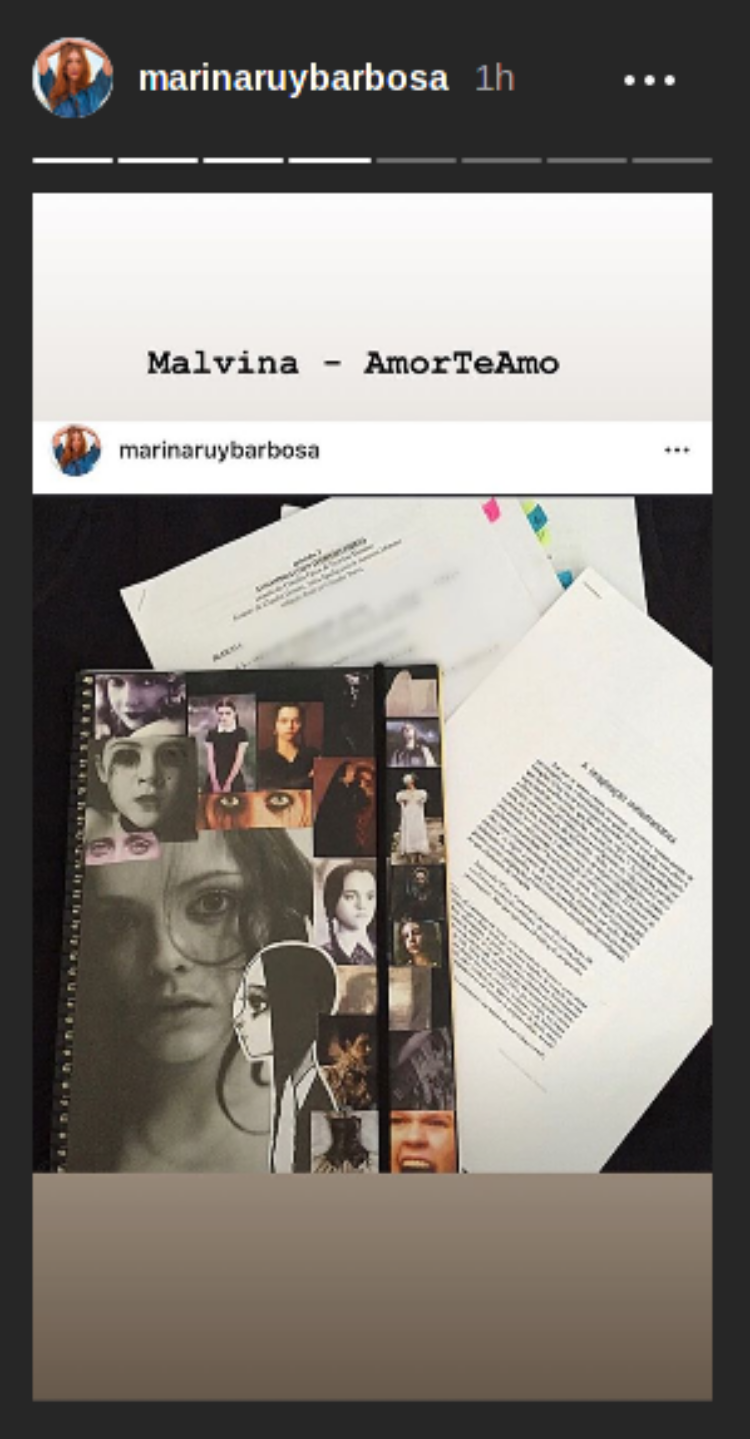 Em seu perfil no Instagram, Marina revelou curiosidades que prepara para viver as suas personagens: “Eu sempre faço um caderno de estudo pra cada personagem, faz parte do meu processo. Esse é o da LUZ de #osetimoguardiao (Próxima novela das 21h que estreia em novembro)”.