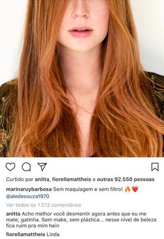 Quem também fez questão de deixar um comentários pra lá de divertido no post foi a funkeira, Anitta. “Acho melhor vocês desmentir agora antes que eu me mate, gatinha. Sem make, sem plástica…nesse nível de beleza fica ruim pra mim hein“, escreveu a dona do hit “Paradinha”.