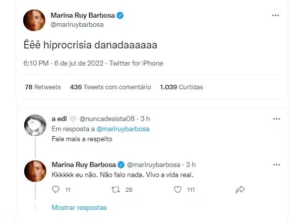 Dessa forma, por meio de uma publicação no Twitter, Marina Ruy Barbosa disparou: “Êêê hipocrisia danadaaaaaa”, escreveu ela na rede social, além de curtir uma publicação de um fã que dizia: “Ihhhh.. quem tem teto de vidro não pode atirar pedra”. No entanto, após a postagem, muitos internautas começaram a deduzir que tal frase seria para Bruno Gagliasso e companhia, que voltaram a expor a polêmica do ‘Surubão de Noronha’.