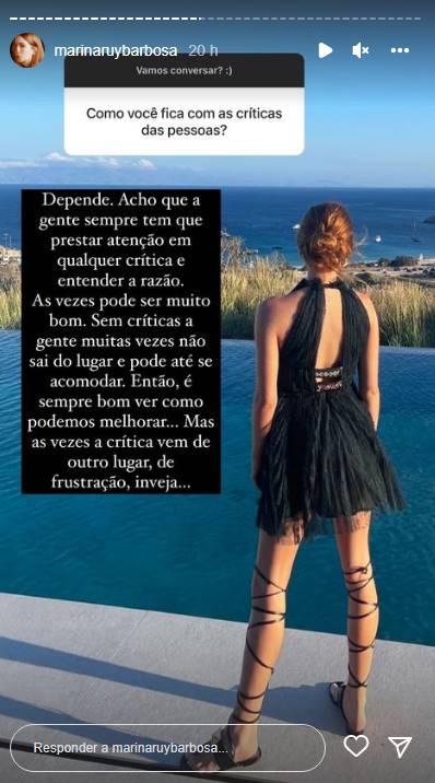 A atriz da Rede Globo Marina Ruy Barbosa, 27 anos, resolveu falar sobre as críticas que vem recebendo ultimamente, tanto em relação a sua vida pessoal quanto profissional. A artista resolveu abrir uma caixinha de perguntas em seu Instagram Stories e por lá falou sobre os recentes acontecimentos que lhe ocorreram.