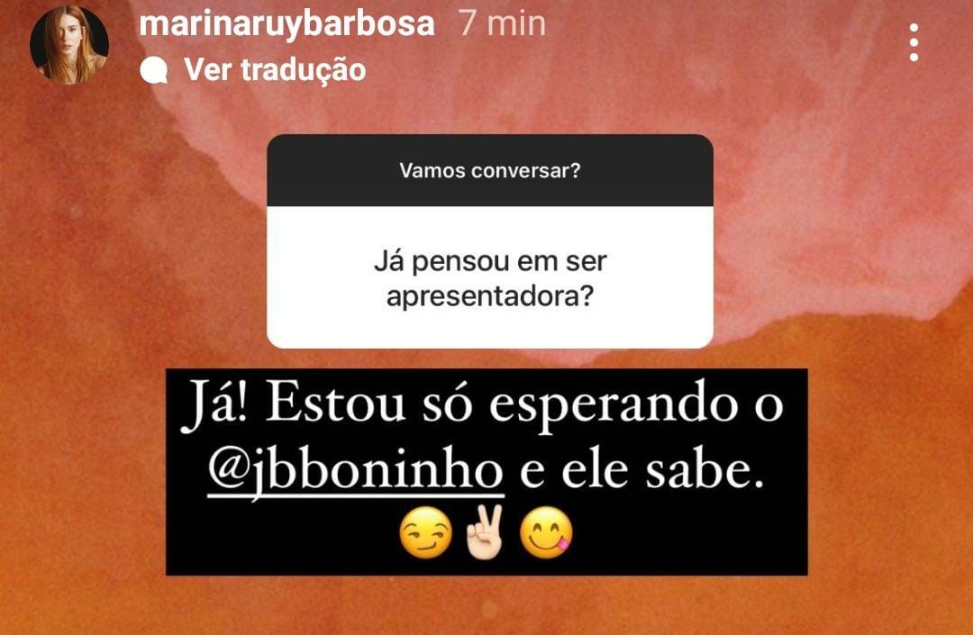 A atriz Marina Ruy Barbosa, de 26 anos de idade, usou suas redes sociais na madrugada desta quarta-feira, 10 de novembro, para revelar um dos seus maiores sonhos. Isso porque por meio de stories em seu Instagram, ela respondeu algumas perguntas de seguidores e citou a vontade de ser apresentadora.
