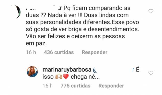 Após as séries de postagem de Bruna, no Instagram de Marina uma fã dela comentou sobre o assunto: “Por que ficam comparando as duas? Nada a ver! Duas lindas com personalidades diferentes. Esse povo gosta só de ver briga e desentendimentos. Vão ser felizes e deixem as pessoas em paz”.