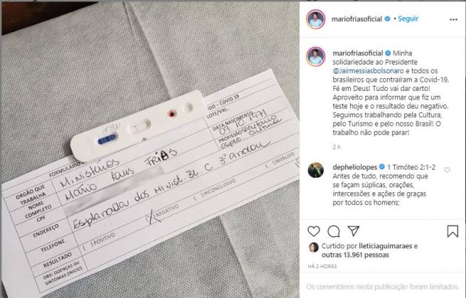 “Minha solidariedade ao Presidente @Jairmessiasbolsonaro e todos os brasileiros que contraíram a Covid-19. Fé em Deus! Tudo vai dar certo! Aproveito para informar que fiz um teste hoje e o resultado deu negativo. Seguimos trabalhando pela Cultura, pelo Turismo e pelo nosso Brasil! O trabalho não pode parar!”, escreveu o ator ao publicar uma foto mostrando o teste que fez para saber sobre o resultado para COVID-19.
