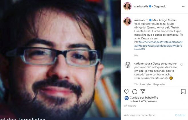 “O querido Michel Fernandes nos deixou hoje. Criador do prêmio Aplauso Brasil, sempre me contagiou com seu amor pelo teatro. Hoje, os aplausos são todos para você”, disse ela na legenda da foto.
