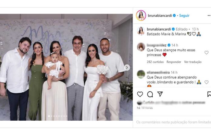 Bruna Biancardi compartilhou com seus seguidores no Instagram, neste domingo (10), um novo registro do batizado da filha Mavie, fruto de seu relacionamento com Neymar. Celebrando o importante momento, a criadora de conteúdo apareceu com os pais, irmã, cunhado e o jogador.