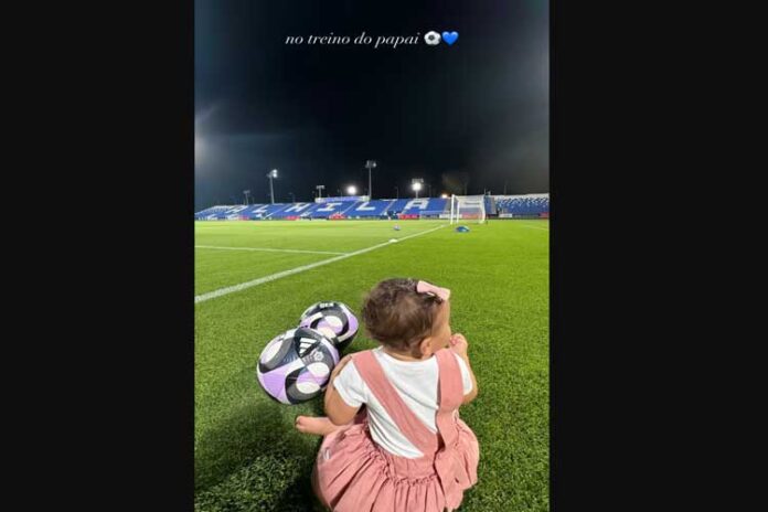 “No treino do papai”, destacou a influenciadora na legenda. Na imagem, a pequena aparece sentada no gramado ao lado de duas bolas de futebol, exibindo toda a sua fofura.