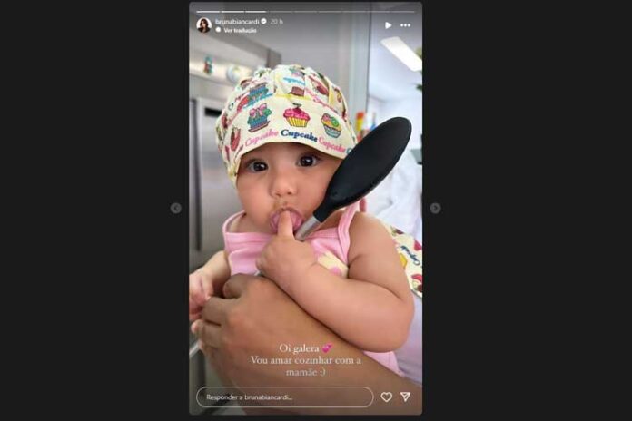 Usando uma toca de cupcake, a herdeira do atacante da Seleção Brasileira esbanja fofura enquanto segura uma colher na mão com o auxílio de Biancardi. “Oi galera, vou amar cozinhar com a mamãe”, disse a influenciadora na legenda.