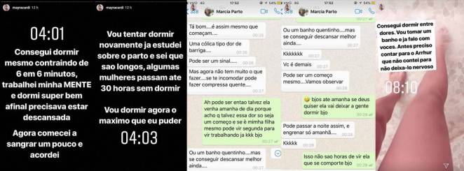 Mayra contou que só havia conseguido dormir entre as dores e que não tinha contado para o marido sobre as contrações, para não preocupá-lo. “Consegui dormir entre dores. Vou tomar banho e já falo com vocês. Antes preciso contar para o Arthur, que não contei para não deixá-lo nervoso”, disse ela, enquanto filmava o marido dormindo tranquilamente. “Às vezes eu acordava com a dor violenta e o Arthur vinha atrás de mim e ele não sabia que estava doendo”.