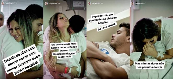 Após as tentativas em casa, depois de dias sem dormir e muitas horas sem comer, Mayra compartilhou que tiveram que ir para o hospital. E lá continuaram horas e horas tentando esperar Sophia descer mais. Em uma das fotos é possível ver Arthur descansando no chão do hospital de tão exausto.