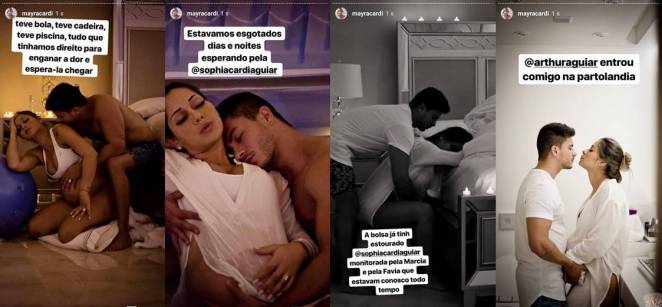 Mayra Cardi compartilhou todo seu processo do trabalho de parto ao lado de seu marido Arthur Aguiar, que como ela mesmo disse, entrou na “partolandia”. Em uma das fotos ela conta que a bolsa já havia estourado.