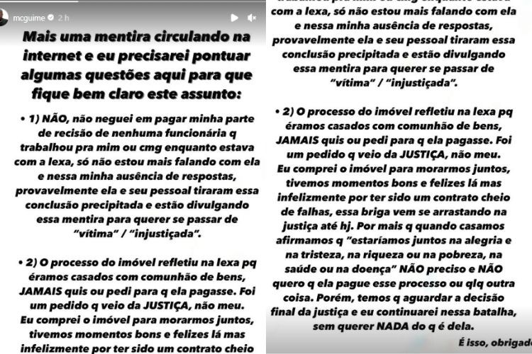 Além disso, Guimê também enfrenta alegações relacionadas a uma suposta rescisão não paga a uma ex-funcionária que trabalhava para ele e Lexa. O funkeiro nega a negação do pagamento, afirmando que nunca se recusou a quitar sua parte na rescisão. No entanto, ele ressalta que, atualmente, não mantém contato com Lexa, o que pode ter levado a mal-entendidos que resultaram em alegações precipitadas.