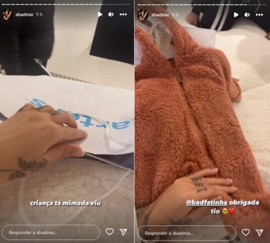 Em sua conta oficial do Instagram Stories, a criadora de conteúdo para a internet resolveu mostrar um presente que recebeu para o seu bebê. Na situação, ela exibe um regalo que ganhou de seu assessor e emociona. Na legenda do vídeo, Mirella escreveu: ”Criança tá mimada viu”.