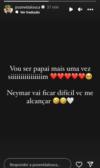 “Vou ser papai mais uma vez, sim!”, escreveu MC Poze do Rodo, através dos Stories do Instagram. Adiante, ele mandou um recado especialmente para o jogador, que se tornou pai de uma menina recentemente: “Neymar, vai ficar difícil você me alcançar”, completou o funkeiro. Até o momento, a mãe do sexto filho de Poze ainda não foi revelada e o músico também não entrou em detalhes.