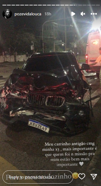 Dessa forma, por meio dos stories no Instagram, MC Poze mostrou a foto da BMW destruída e ainda pontuou: “Você lembra na oração na qual a irmã falou para tomar cuidado com o volante”, enfatizou um internauta, sobre o acidente. “Não estava no volante nem no carro, tropa”, afirmou o cantor. “Rapaziadinha está perguntando se é a X5 (modelo mais atual da BMW). Não é a X5 não. Foi o outro carro, a X3. Meu xodozinho”, explicou ele, revelando o nome carinhoso que deu pro carro.