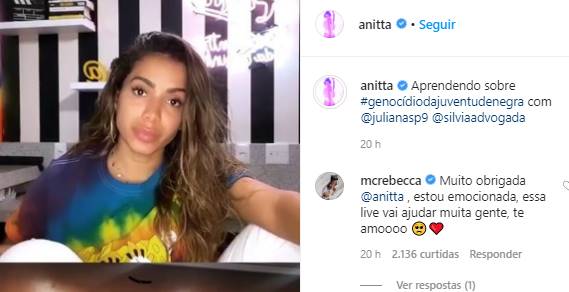 Nos comentários, a artista recebeu muitos elogios pela atitude. MC Rebecca, que é uma mulher preta, se mostrou emocionada com a atitude da amiga. “Muito obrigada @anitta, estou emocionada, essa live vai ajudar muita gente, te amoooo”, escreveu ela.