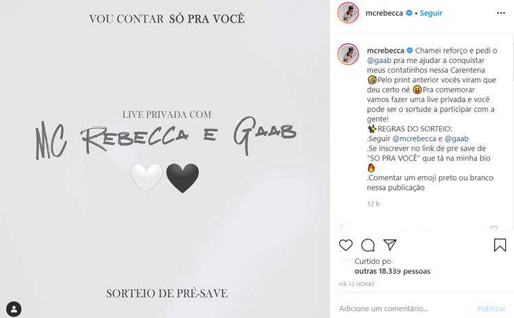 MC Rebecca pediu a colaboração de fãs e amigos para o pré-save nas plataformas digitais e garante um sorteio para uma live privada entre ela e Gaab: “Gente, quero todo mundo postando. Meus amigos que são meus amigos podem postando, ta? Meus fãs também podem postando a pré-save”, anuncia a funkeira empolgada com o novo trabalho.