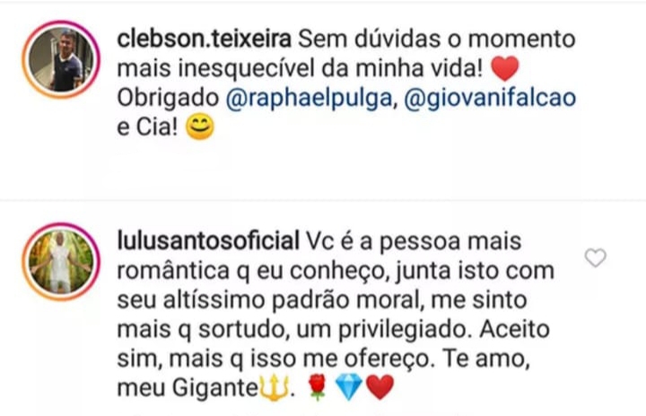 Lulu então respondeu o post do noivo elogiando seu lado romântico. “Você é a pessoa mais romântica que eu conheço. Junta isso com seu altíssimo padrão moral! Me sinto mais que sortudo, um privilegiado. Aceito sim, mais que isso me ofereço. te amo, meu Gigante”, respondeu.