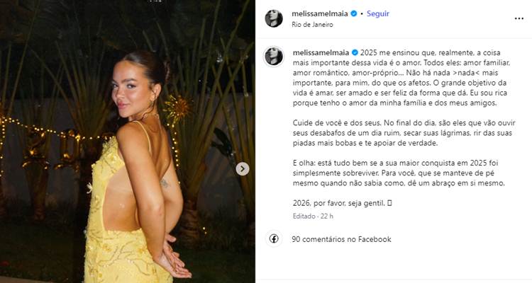 Em seu perfil no Instagram, Mel Maia publicou vários registros da virada do ano. “2025 me ensinou que, realmente, a coisa mais importante dessa vida é o amor. Todos eles: amor familiar, amor romântico, amor-próprio… Não há nada >nada< mais importante, para mim, do que os afetos. O grande objetivo da vida é amar, ser amado e ser feliz da forma que dá. Eu sou rica porque tenho o amor da minha família e dos meus amigos”, começou a escrever na legenda do post.