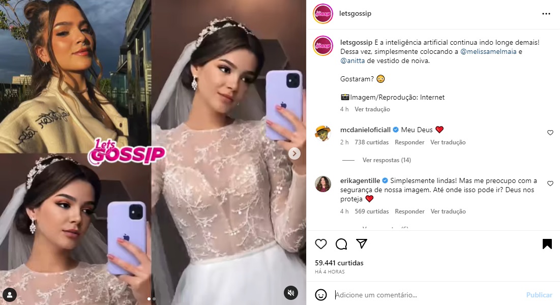 No vídeo, Mel Maia surge vestindo uma linda peça branca. Deixando o vídeo ainda mais real, a jovem atriz também apareceu com véu e uma maquiagem preparada para esse momento mais do que especial. “A inteligência artificial continua indo longe demais!”, brincou um dos internautas assim que viu a gravação em questão.