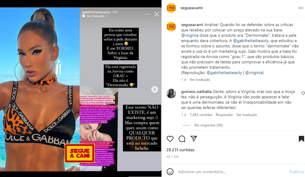 A web, rapidamente, reagiu à postagem. Desse modo, um deles apontou que concorda com Gabi Freitas e afirmou que Virginia deveria ser mais honesta: “Gente, adoro a Virgínia, mas isso que a moça fez, não é perseguição. A Virgínia não pode aparecer e falar que é uma dermomake, se não é! Irresponsabilidade em não sei quantas esferas diferentes!”.