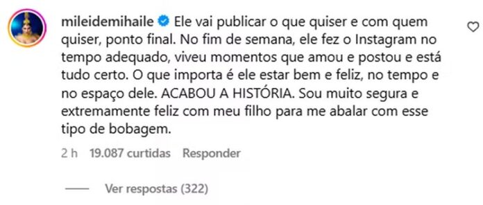 “Ele vai publicar o que quiser e com quem quiser, ponto final. No fim de semana, ele fez o Instagram no tempo adequado, viveu momentos que amou e postou e está tudo certo. O que importa é ele estar bem e feliz, no tempo e no espaço dele. ACABOU A HISTÓRIA. Sou muito segura e extremamente feliz com meu filho para me abalar com esse tipo de bobagem“, escreveu a mãe de Yhudi Lima.