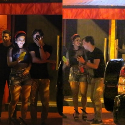 Nos registros é possível ver que ela está sorridente e ligada boa parte do tempo em seu celular. Para a ocasião ela apostou em um look despojado, short jeans e blusa azul marinho com leve transparência. (fotos abaixo)