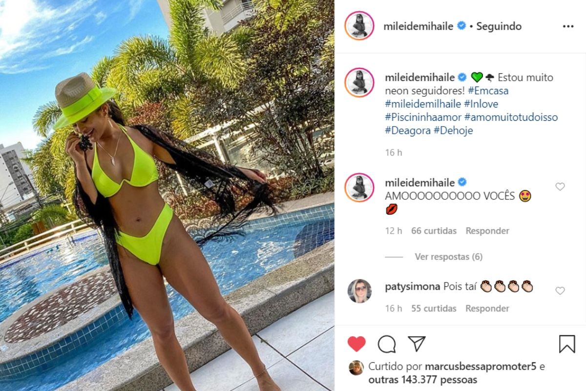 Na legenda da publicação, ela brincou com o biquíni: “Estou muito neon seguidores”, disse a celebridade, que finalizou com as hashtags ‘Em Casa’, ‘Mileide Mihaile’, ‘In love’, ‘Piscininha amor’, ‘Amo muito tudo isso’, ‘De agora’ e ‘De Hoje’. Veja na captura abaixo feita pela equipe do Área VIP:
