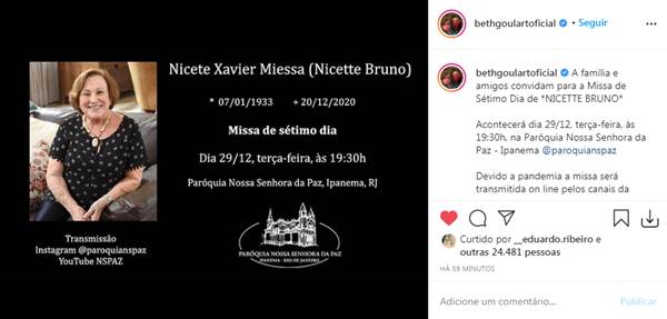 Na rede social, Beth Goulart escreveu. “A família e amigos convidam para a Missa de Sétimo Dia de *NICETTE BRUNO* Acontecerá dia 29/12, terça-feira, às 19:30h, na Paróquia Nossa Senhora da Paz – Ipanema @paroquianspaz”, escreveu.