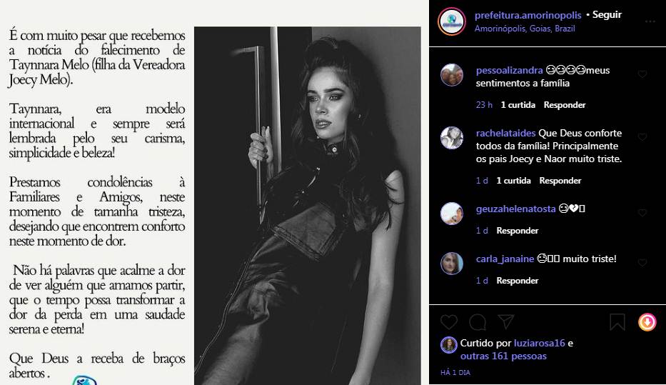 A prefeitura da cidade prestou condolências à famílias nas redes sociais. “É com muito pesar que recebemos a notícia do falecimento de Taynnara Melo”, escreveu a equipe do município em um post no perfil oficial do Instagram.
