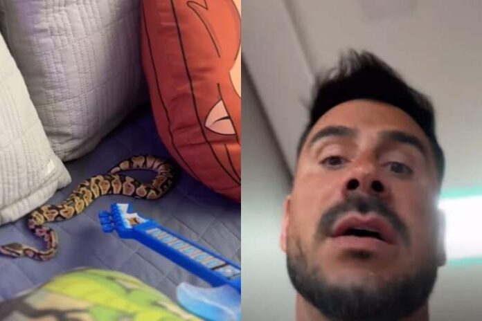 A revelação do fato ocorreu nos stories do perfil próprio artista no Instagram, onde ele gravou e mostrou o momento aos fãs: “Gente! Pelo amor de Deus! Olha o que acabei de achar em cima das crianças. Meu Deus do Céu”, declarou ele com a voz ofegante, enquanto a cobra andava pela cama.