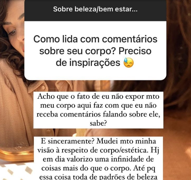 Levando a linha da sinceridade ela revelou que mudou um pouco sua opinião em relação á estética; “Acho que o fato de eu não expor muito meu corpo aqui faz com que eu não receba comentários falando sobre ele, sabe?”
