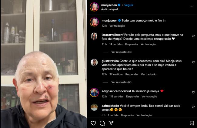 Além disso, ela também alega que se encontrou com a médica responsável pelo caso: ”É só para vocês saberem. Funciona. O tratamento é assim mesmo e está melhorando. Fui ontem na médica e ela disse: ‘Parabéns’. Então, fiquem tranquilos”. Em outro vídeo divulgado na mesma rede social, a Monja relata que tudo possui começo, meio e fim.